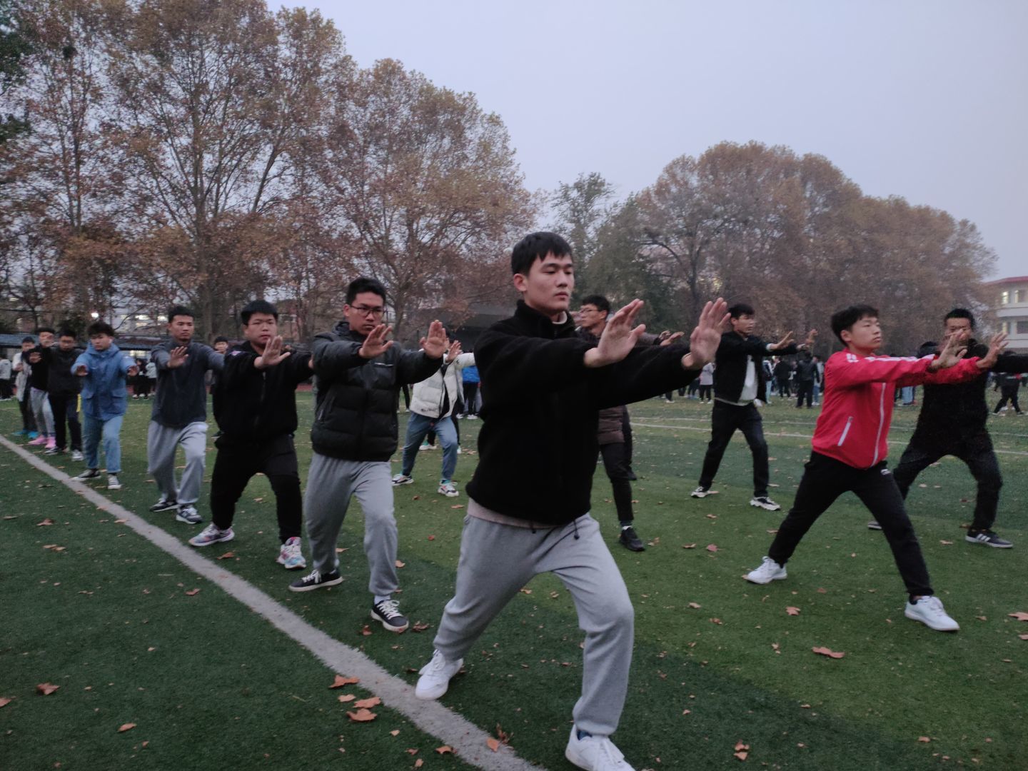 每天早上6时20分,同学们以班为单位在南院足球场集合。然后由体委点名考察人数并将考察情况汇报给学习部。考察结束后,同学们迈着统一的步伐,喊着洪亮的口号,保持整齐的队形绕着操场进行慢跑热身。热身过后,同学们随着太极音乐练习杨氏四十二式太极拳。各班队伍有序地展开,每班都选出学生代表和体委在班级前面带队。白鹤亮翅的优雅,左右云手的轻盈,双峰贯耳的矫健,太极拳的形与意在同学们手上一一浮现。整齐划一,别有一番韵味。每一招,每一式无不体现着中国功夫的博大精深。