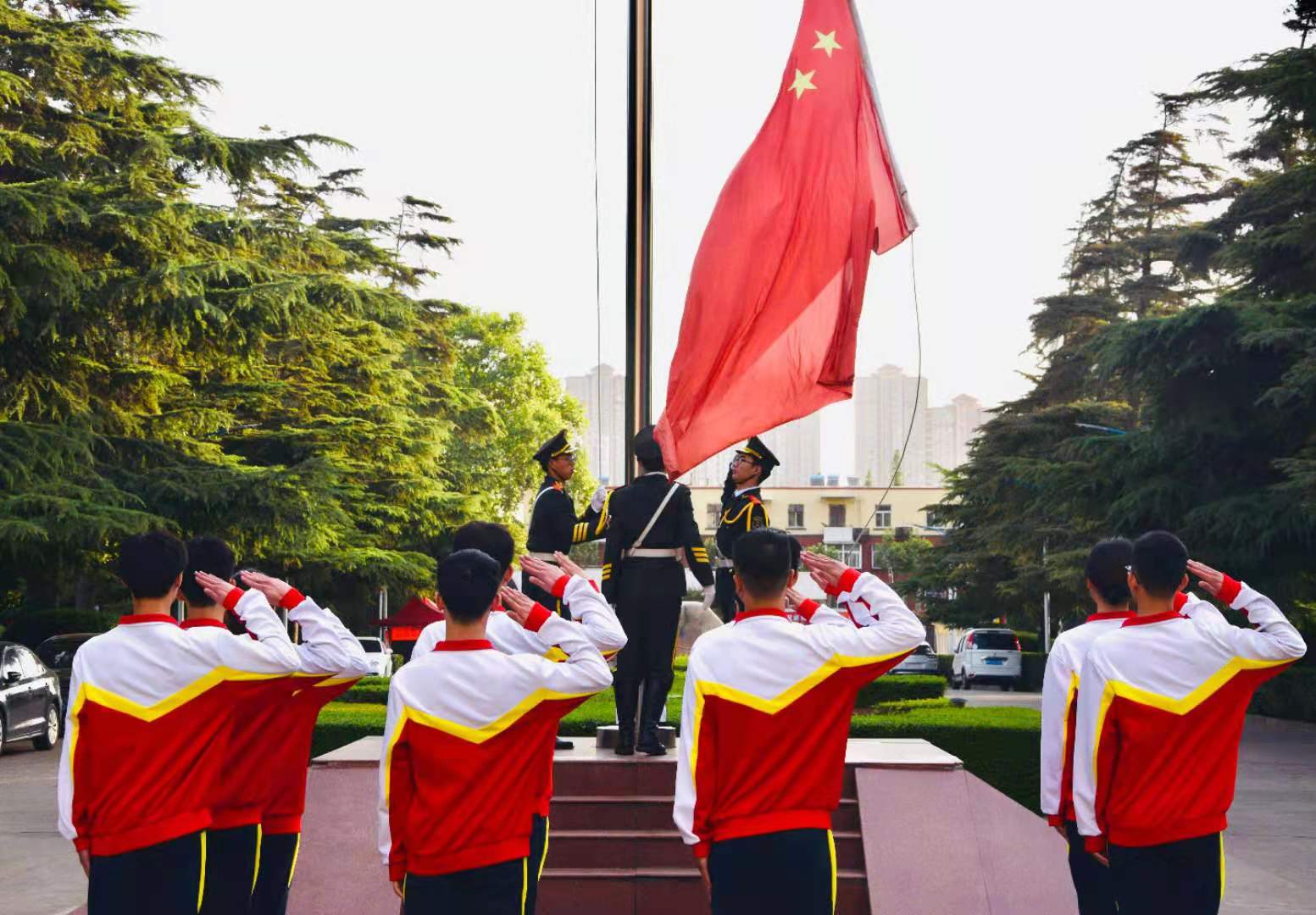 升旗仪式开始,国旗班的旗手们迎着朝阳,迈着整齐有力的步伐,以饱满的热情,庄严地护卫着五星红旗。当庄严神圣的《义勇军进行曲》奏响时,五星红旗冉冉升起,随风飘扬,全体师生行注目礼。