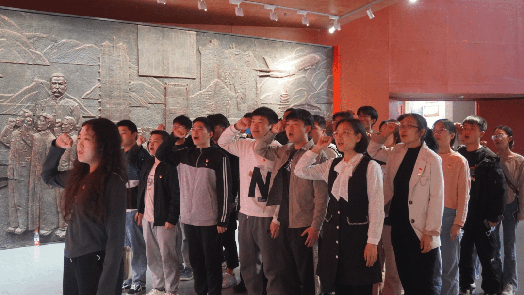 参观结束后,学生代表们齐聚在中心广场,整齐列队,面向鲜艳的党旗,庄严肃穆地举起右手进行宣誓,重温入党誓词。