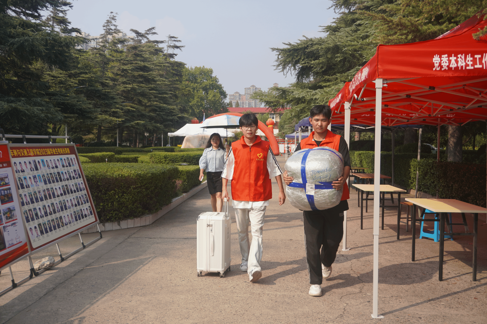 志愿者们一大早就来到工作岗位进行迎新准备工作,活动开始,志愿者们在岗位上耐心协助新生办理报到手续,热心帮助新生搬运行李,解决了诸多报到过程中出现的问题,为新生们提供了及时的帮助。在志愿者们的热情服务下,我院2023级全体新生入学报道工作圆满完成。