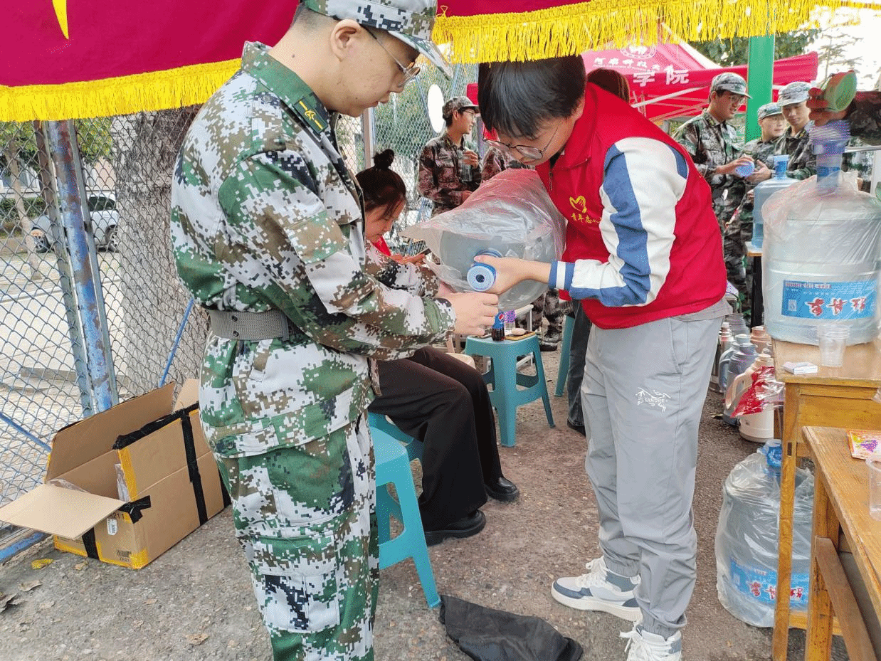 每天,志愿者们在负责人的带领下清理军训场地,安置帐篷,准备军训物资,并在帐篷下为需要的同学提供水、葡萄糖等补给品。志愿者们热情洋溢,各司其职,切实保障军训工作圆满结束。