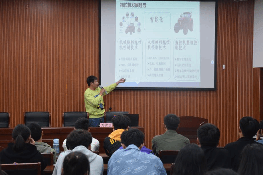 刘伊滨首先向同学们讲述了自己的大学生活和总结的经验。随后,他为同学们详细介绍了农业机械的发展历史、农机分类以及农业机械的行业现状。最后,他向同学们分享了他的考研经历,并就如何规划大学生活和毕业去向提出建议。