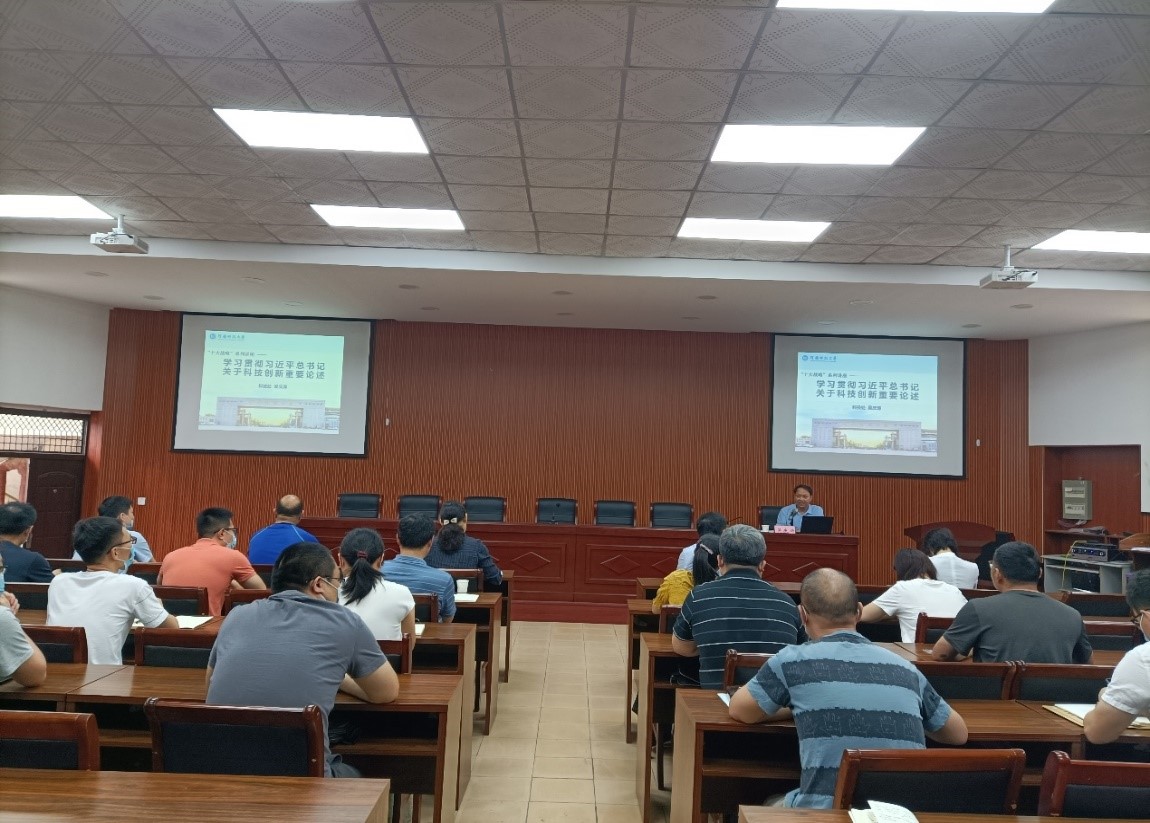 吴庆涛从起源背景和科学内涵两个方面,用丰富案例和大量数据深刻阐述了习近平总书记关于科技创新重要论述;从战略的提出、战略目标、顶层设计和实现路径四个方面,对我省“创新驱动、科教兴省、人才强省”战略进行了全面深入解读;从我校五大科技创新工程、四位一体的科技创新体系两个方面,详细介绍了我校“十四五”科技创新专项规划的主要内容。同时,吴庆涛结合学院的科技创新工作现状指出,学院的科技创新工作要在加强对外交流合作、注重科研团队建设和营造良好科研生态与创新氛围等方面下功夫,全体教师尤其是年轻博士要紧抓学校创建“双一流”的发展机遇,直面挑战,积极投身教学科研,为学校和学院事业高质量发展贡献智慧和力量。