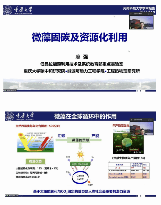 2022年12月9日下午,重庆大学能源与动力工程学院院长、教授、博士生导师廖强老师应邀为我校作题为“微藻固碳及资源化利用”的线上学术报告,我校相关学科教师与研究生通过线上会议形式认真聆听精彩报告,报告会由7003全讯白菜网副院长梁坤峰教授主持。
